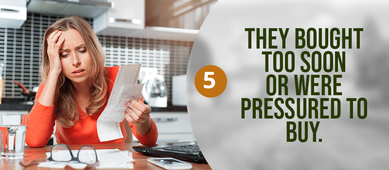 Buyer's remorse occurs if the homeowner is feeling one (or more) of these things:One of the main causes of buyer's remorse is financial stress. In fact, the said survey found that 30 percent of buyers said they spent too much money. Especially for first-time home buyers, they can easily be tempted to stretch their budget after learning that there are multiple offers on the table. Then the realization often hits them at or right before closing, when they see all the closing costs they have to cover. Plus, the costs of homeownership, including the monthly mortgage payments, property taxes, homeownership insurance, property upkeep, and others, turn out to be higher than anticipated.