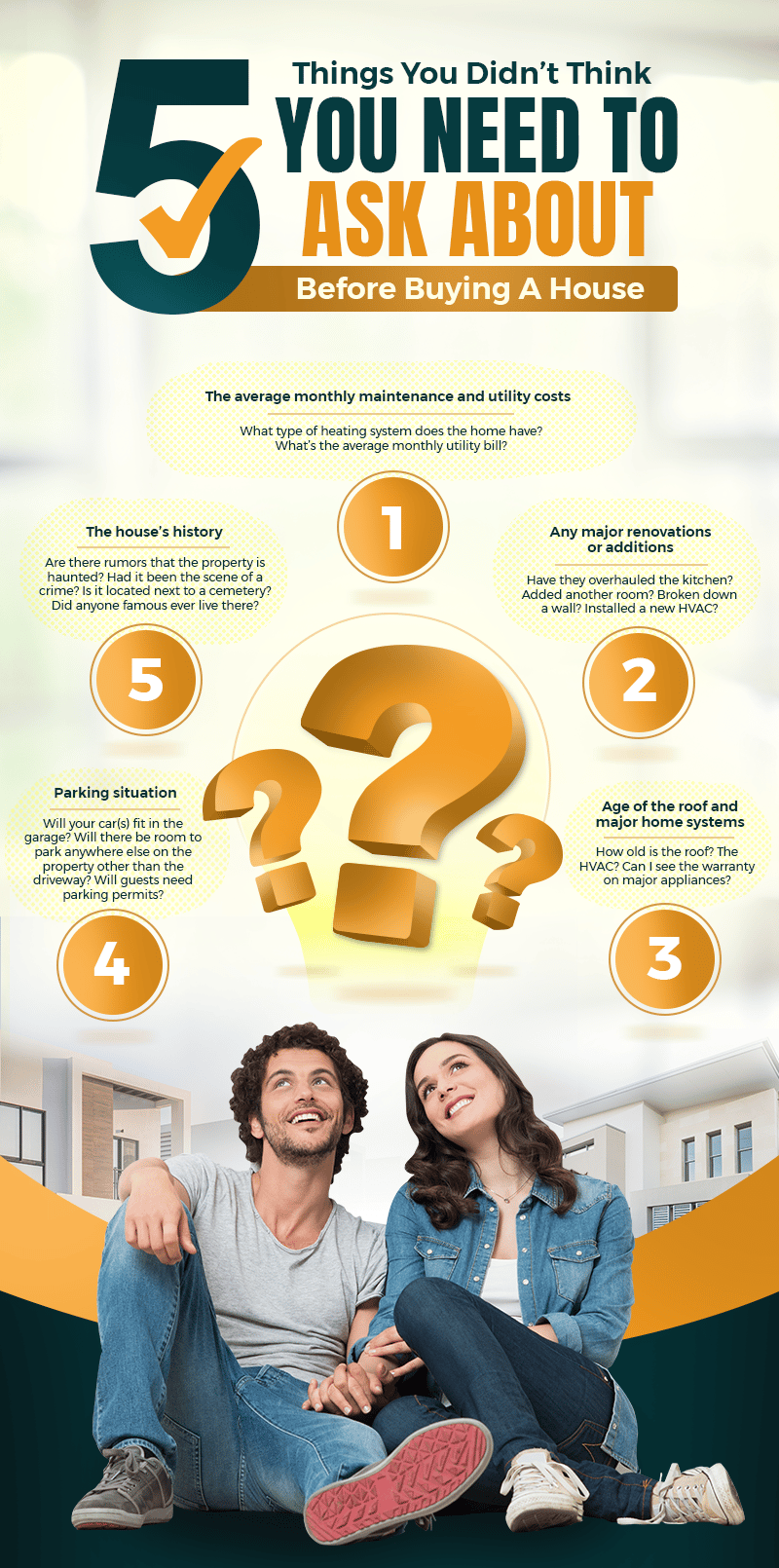 Need to dig deeper into the home you're looking to buy? Asking the right questions — and not just the kind that randomly pops into your head — can help you get as much information as you need to put together a competitive offer. Likewise, you will be able to save time, money, and potential headaches if you hit all the necessary topics head-on. It’s part of your due diligence as a buyer, especially since this could be one of the biggest financial commitments you'll ever make.